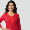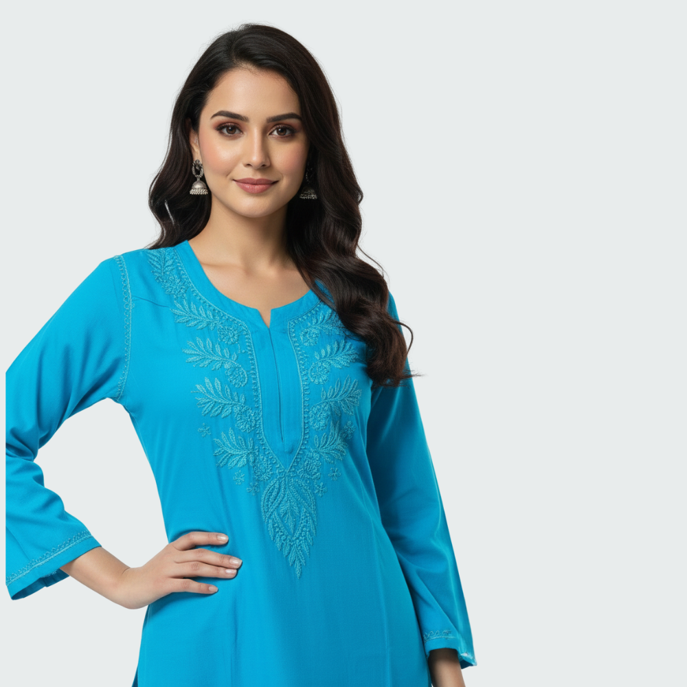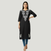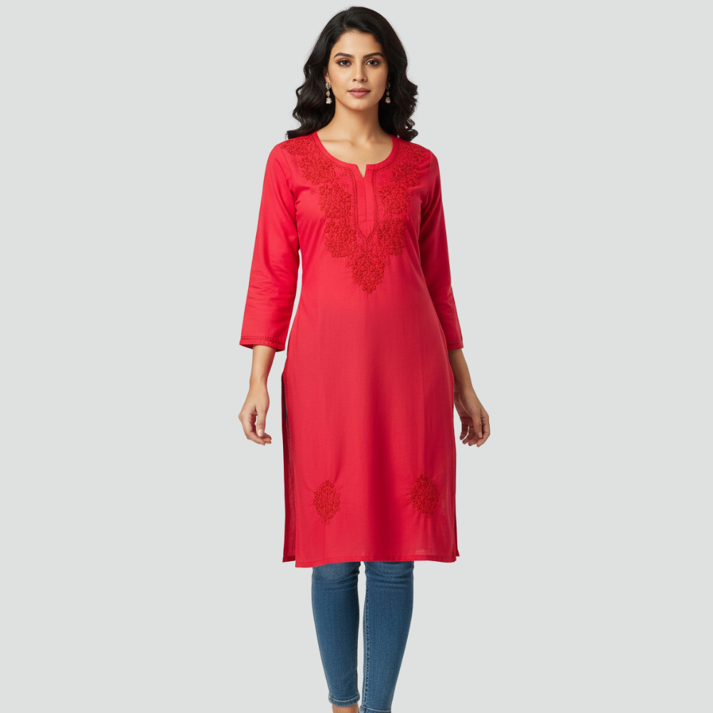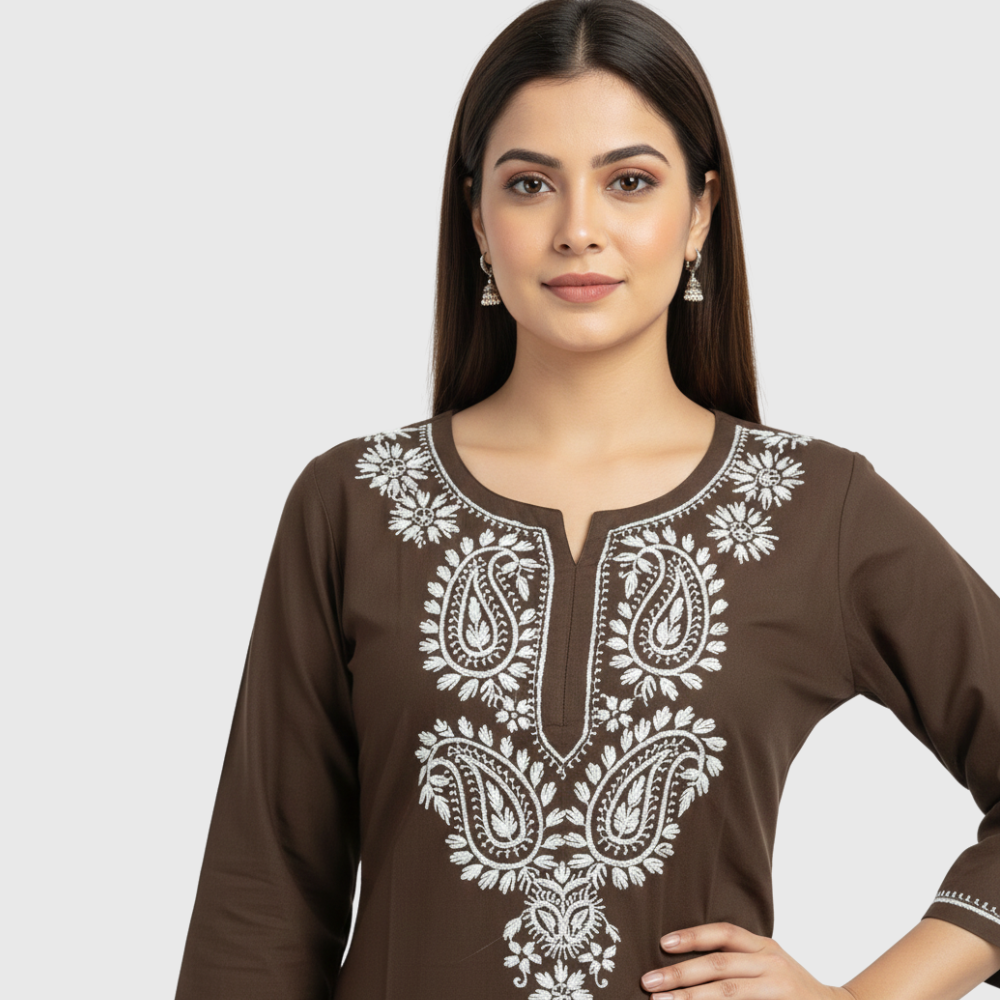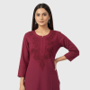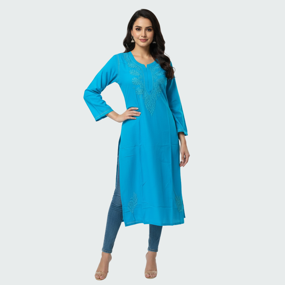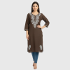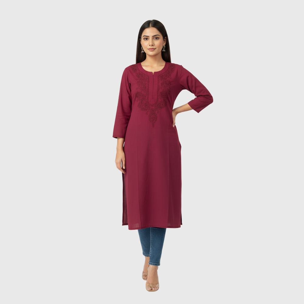 Made from a soft, breathable fabric, it offers a relaxed fit with three-quarter sleeves and a sleek straight-cut silhouette, making it perfect for office wear, casual outings, or daily comfort. The minimal yet detailed threadwork enhances its charm, giving you a refined ethnic look that transitions beautifully from day to evening.