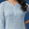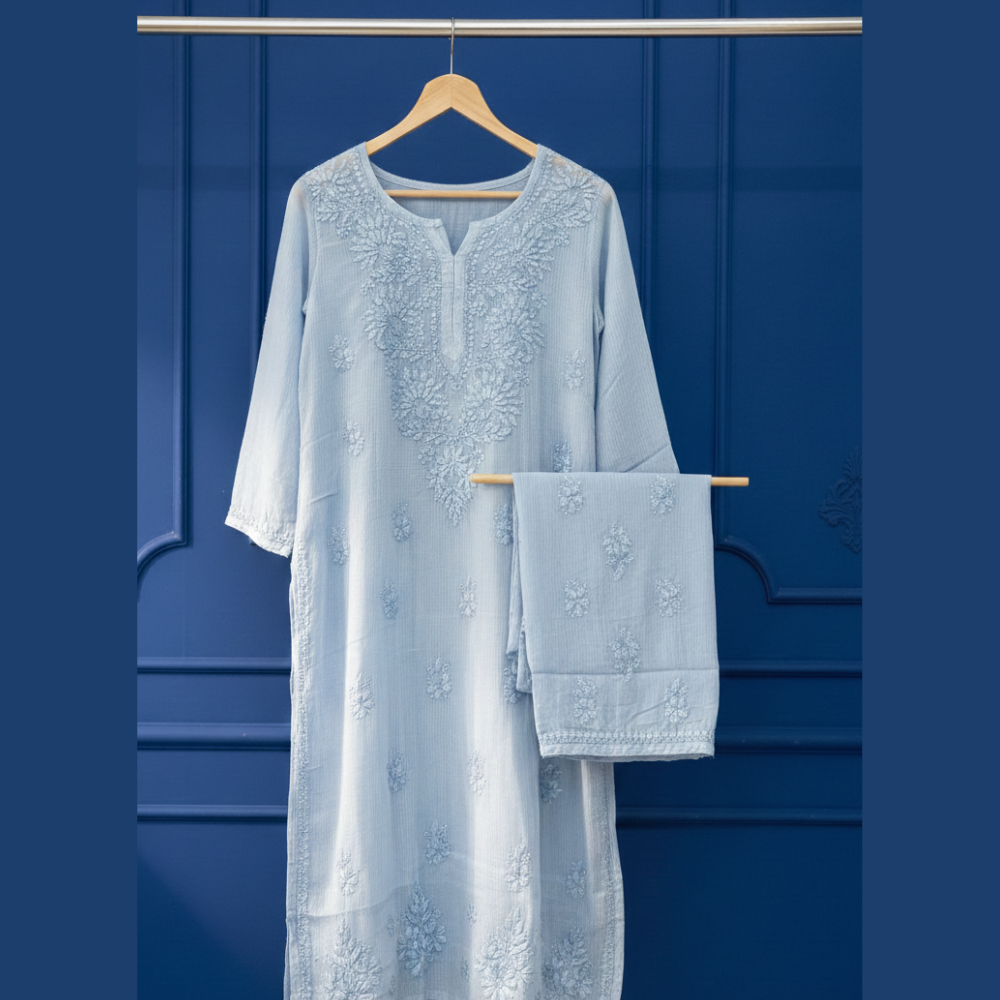 Kota Chikankari Kurta Set crafted with lightweight, breathable fabric and adorned with fine hand embroidery, paired with coordinated bottoms for a graceful and comfortable look suited for all-day wear.
