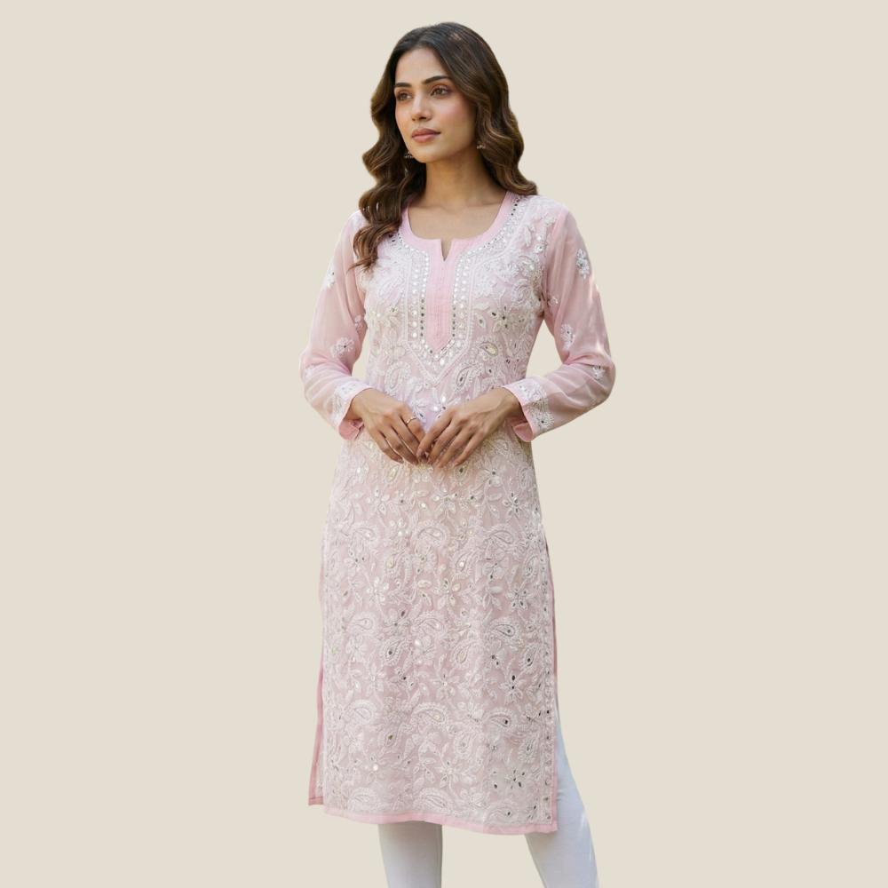 Georgette Chikankari Kurti embellished with mirror work, featuring intricate embroidery that adds a festive sparkle and a graceful flow to the silhouette.